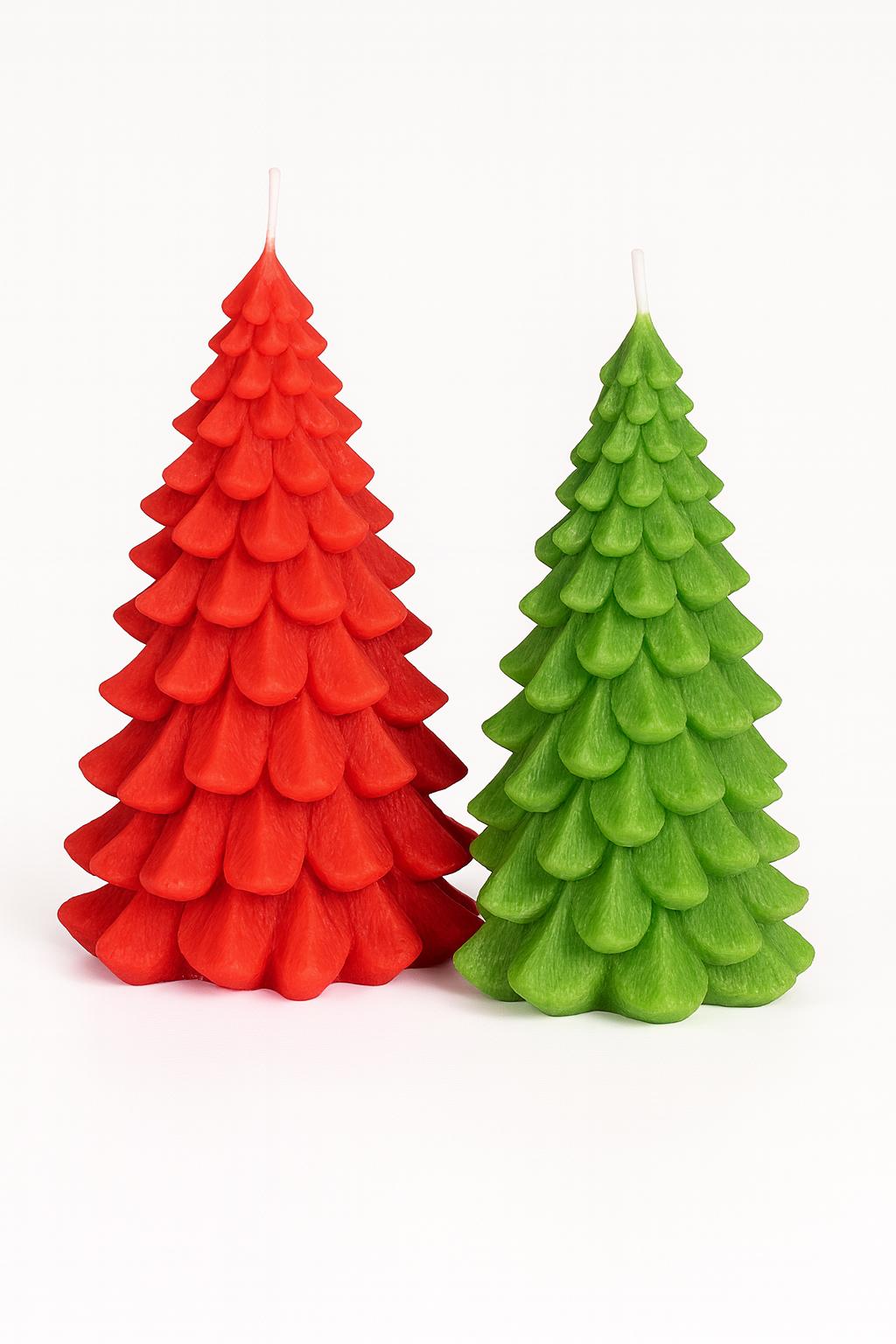 A vibrant pair of Christmas tree candles crafted in traditional red and green tones. Featuring layered scale-like detailing, these candles instantly elevate any holiday corner with warmth and festive charm.