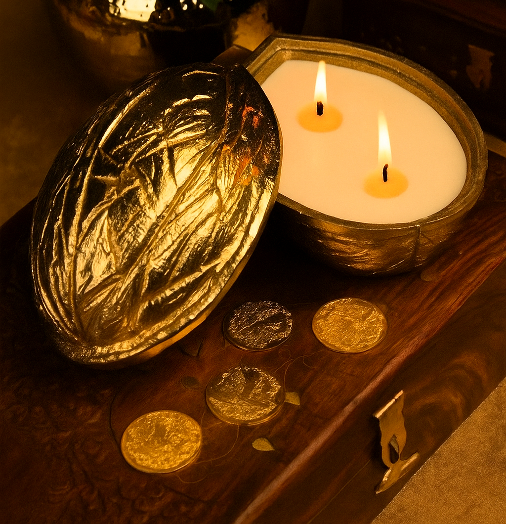 Evoke the essence of exotic charm with the Golden Coconut Grove Dual-Wick Candle Holder from Xclusive Art. This stunning piece features a brilliantly textured golden shell, artfully designed to resemble a natural coconut. When opened, it reveals two radiant wicks, ready to cast a warm, tranquil glow across your space. Its unique design and lustrous finish make it a captivating addition to any decor, perfect for creating a serene atmosphere or serving as an eye-catching decorative accent. Let the Golden Coconut Grove bring a touch of golden allure and sophisticated warmth to your home or as a distinguished gift.