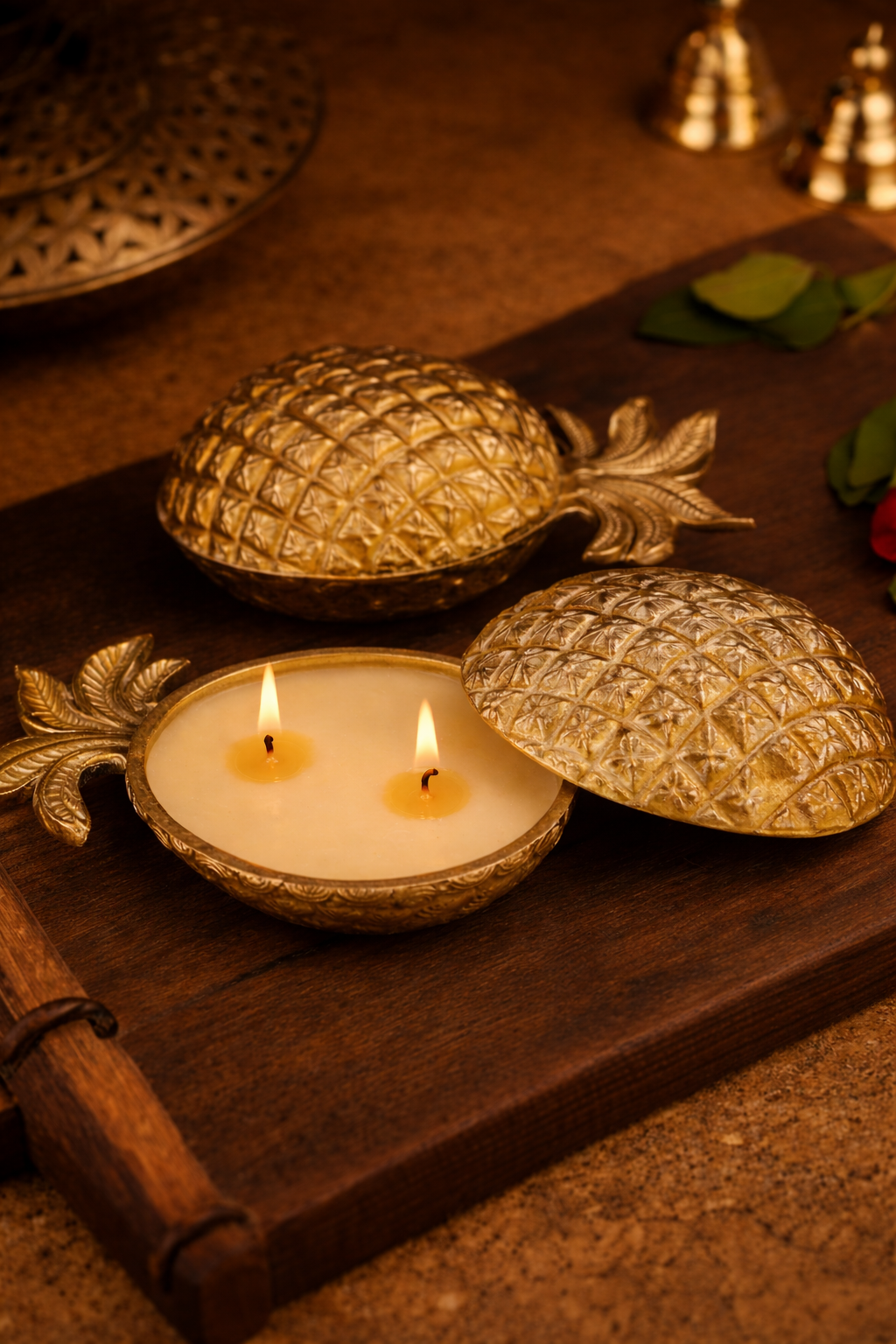 Bring a touch of tropical luxury to your home with the Golden Pineapple Dual-Wick Candle Holder from Xclusive Art. Crafted from high-quality aluminium with a shimmering golden finish, this magnificent piece beautifully captures the iconic texture and crown of a pineapple. Lift the top to reveal two soft, glowing wicks that cast a warm and inviting light, creating an atmosphere of sophisticated serenity.