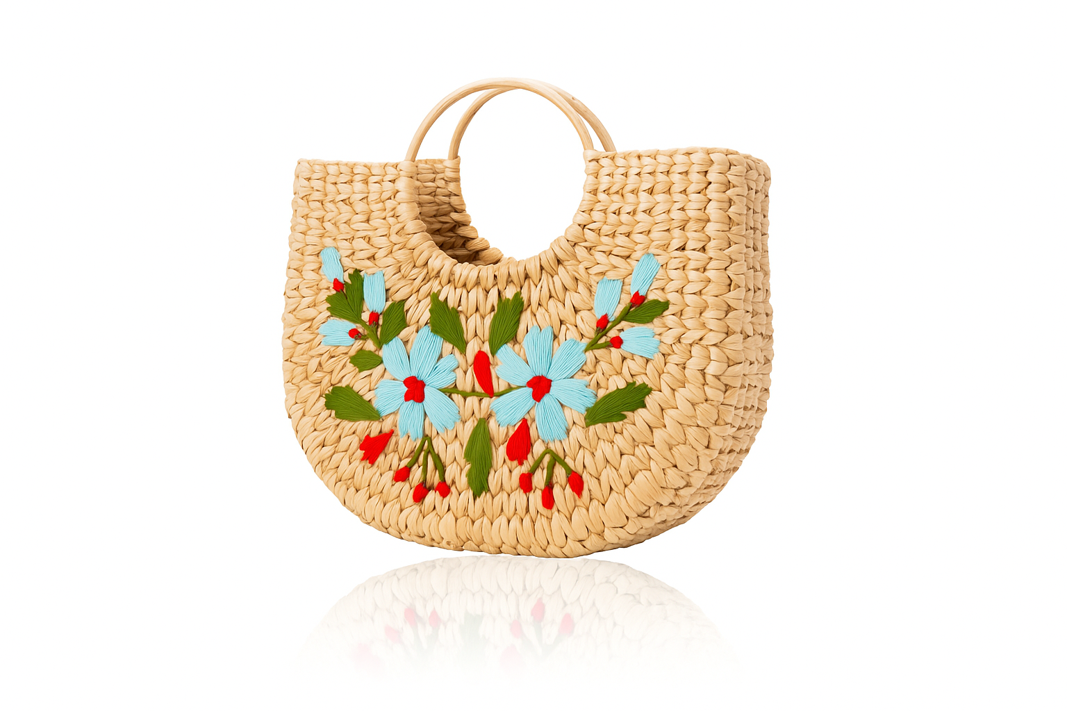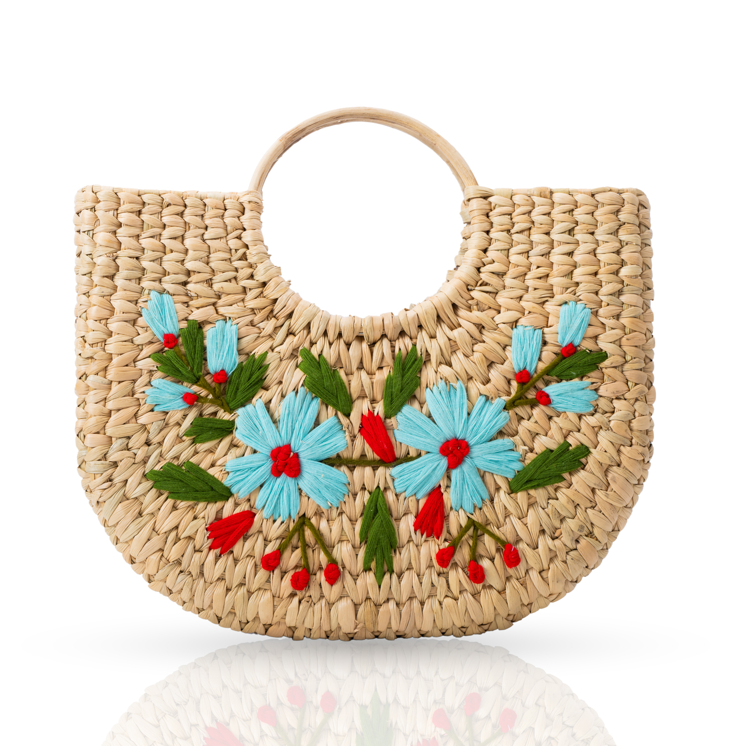 What truly sets the Blossom Breeze apart is its vibrant, hand-embroidered floral design. Delicate sky-blue blossoms, accented with playful red berries and lush green leaves, dance across the natural straw, creating a captivating and unique visual appeal. Perfect for your beach excursions, farmer’s market visits, or adding a touch of bohemian charm to your everyday ensemble, this tote is both a practical accessory and a wearable piece of art.