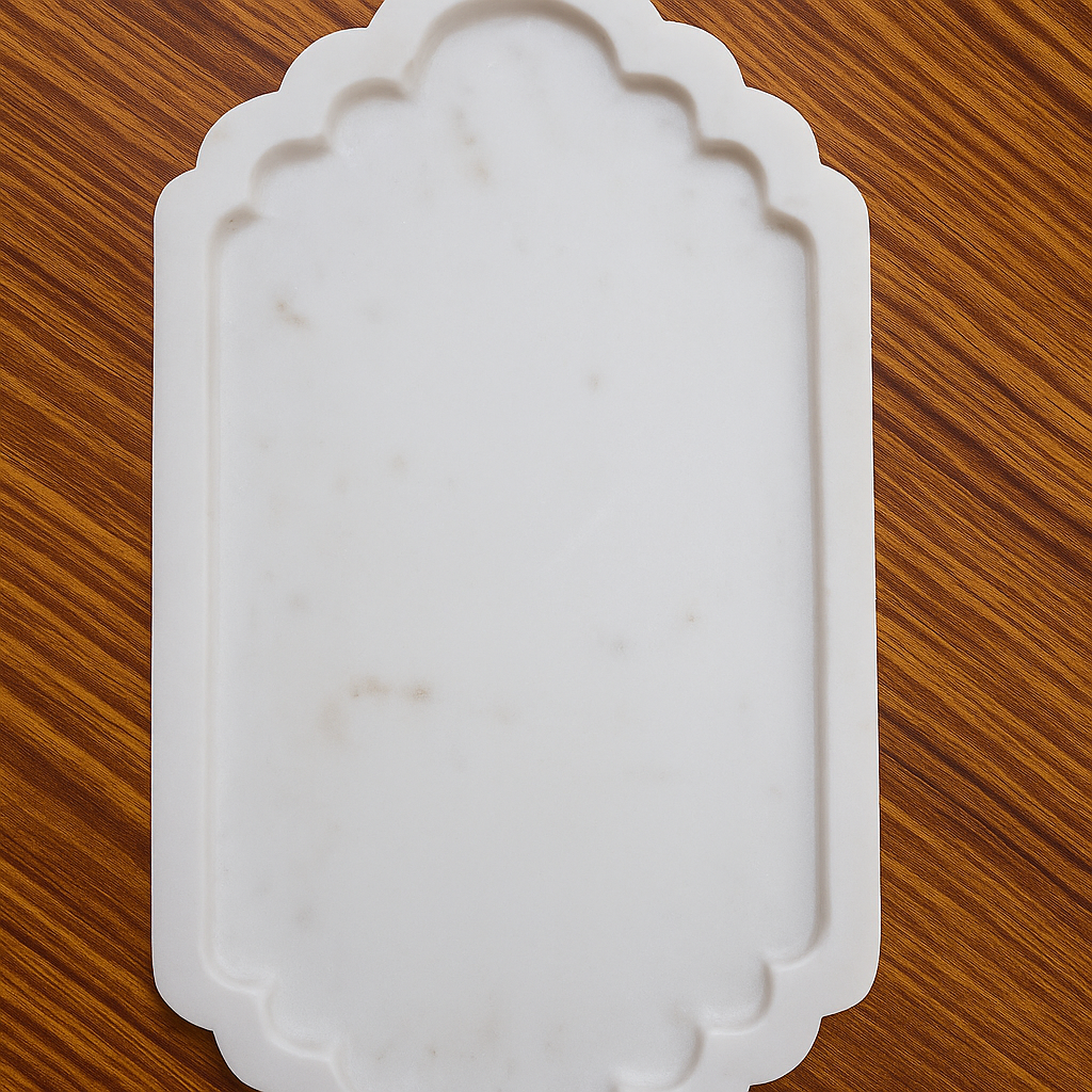 Expertly handcrafted from premium white marble, this tray features a royal scalloped edge design that reflects timeless Mughal artistry. Its smooth, polished surface adds sophistication to any setting — whether used for serving, gifting, or as a decorative base for candles, perfumes, or idols.