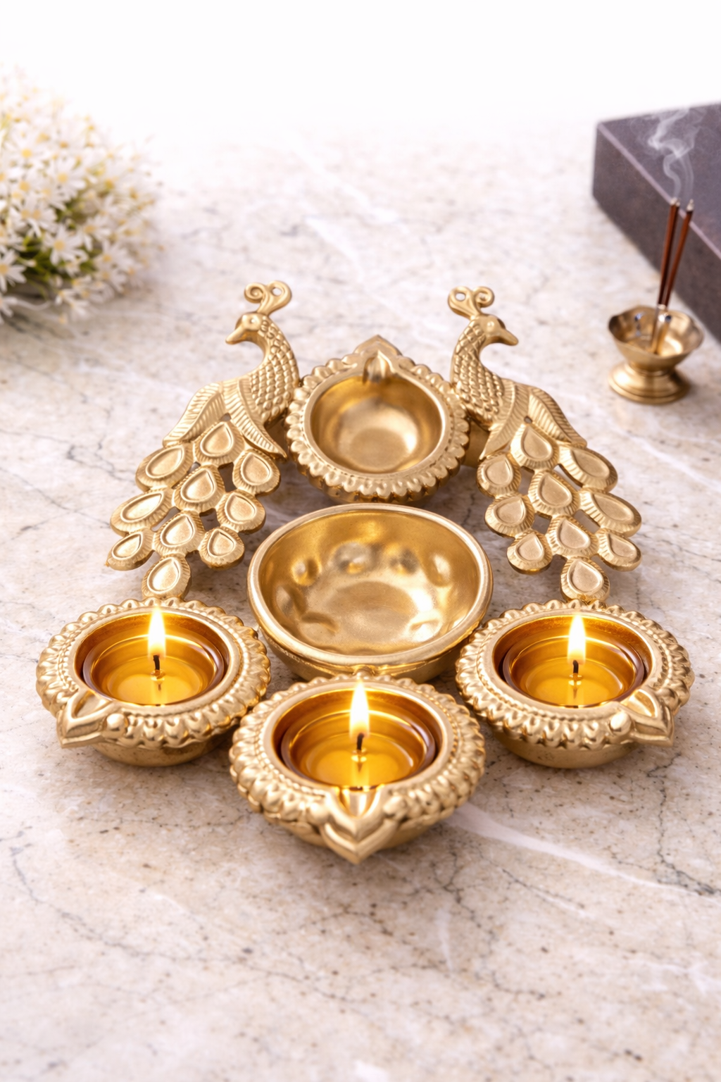 Each piece is finished in a radiant antique gold, casting a warm and inviting glow when lit. The peacock, a symbol of beauty, grace, and divinity in many cultures, adds a touch of auspiciousness and grandeur to this set. The detailed craftsmanship in each diya and the peacocks reflects a commitment to traditional artistry.