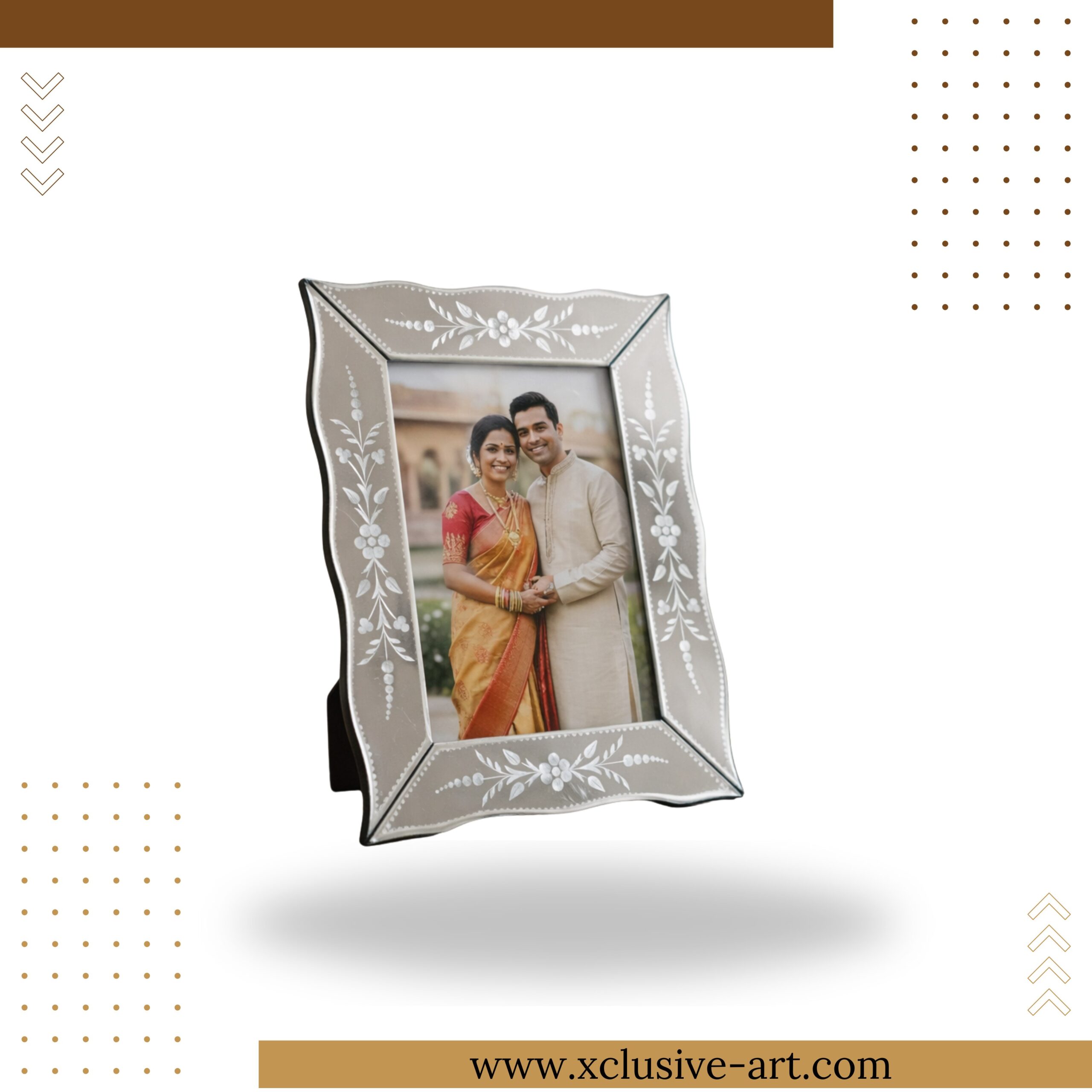 Present your cherished memories in the elegant Xclusive Table Photo Frame. This striking square frame features a unique, gently undulating or wavy mirrored border, setting it apart from conventional designs. Adorned with delicate white etched floral and dot patterns, it offers a sophisticated blend of classic artistry and modern aesthetics.